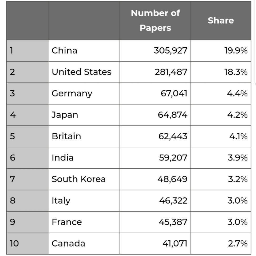 প্রতিবেদনে দেখা যায় ৩০৫,৯২৭ টি সায়েন্টিফিক পেপার চীনকে তালিকার শীর্ষে রেখেছে। এদিকে, আমেরিকা ২৮১,৪৮৭ টি পেপার নিয়ে তালিকার দ্বিতীয় অবস্থানে রয়েছে।